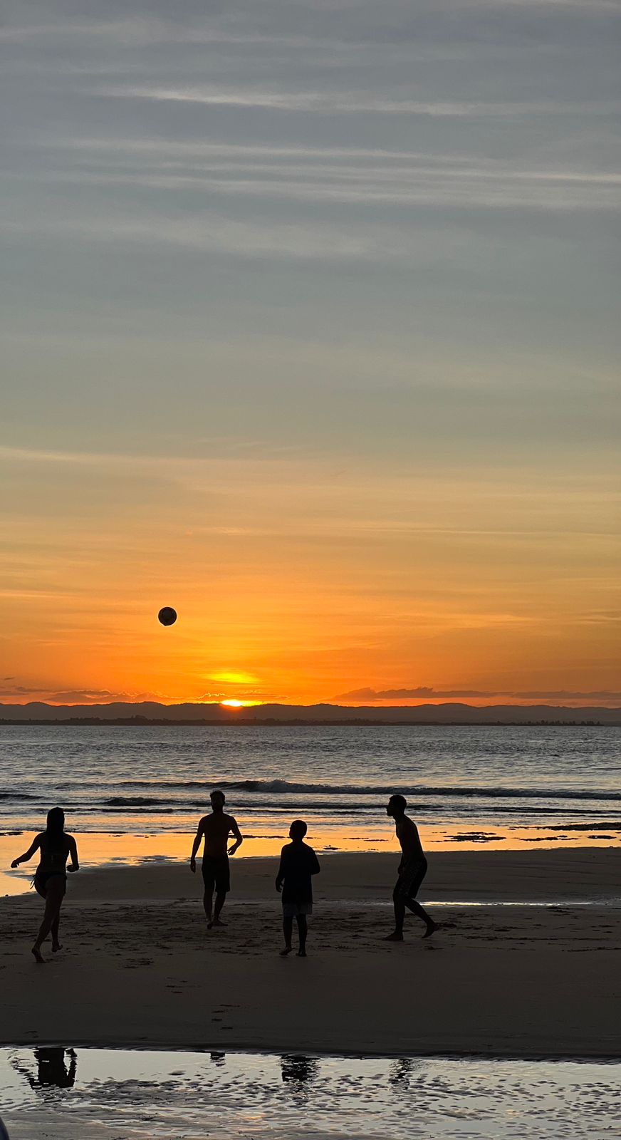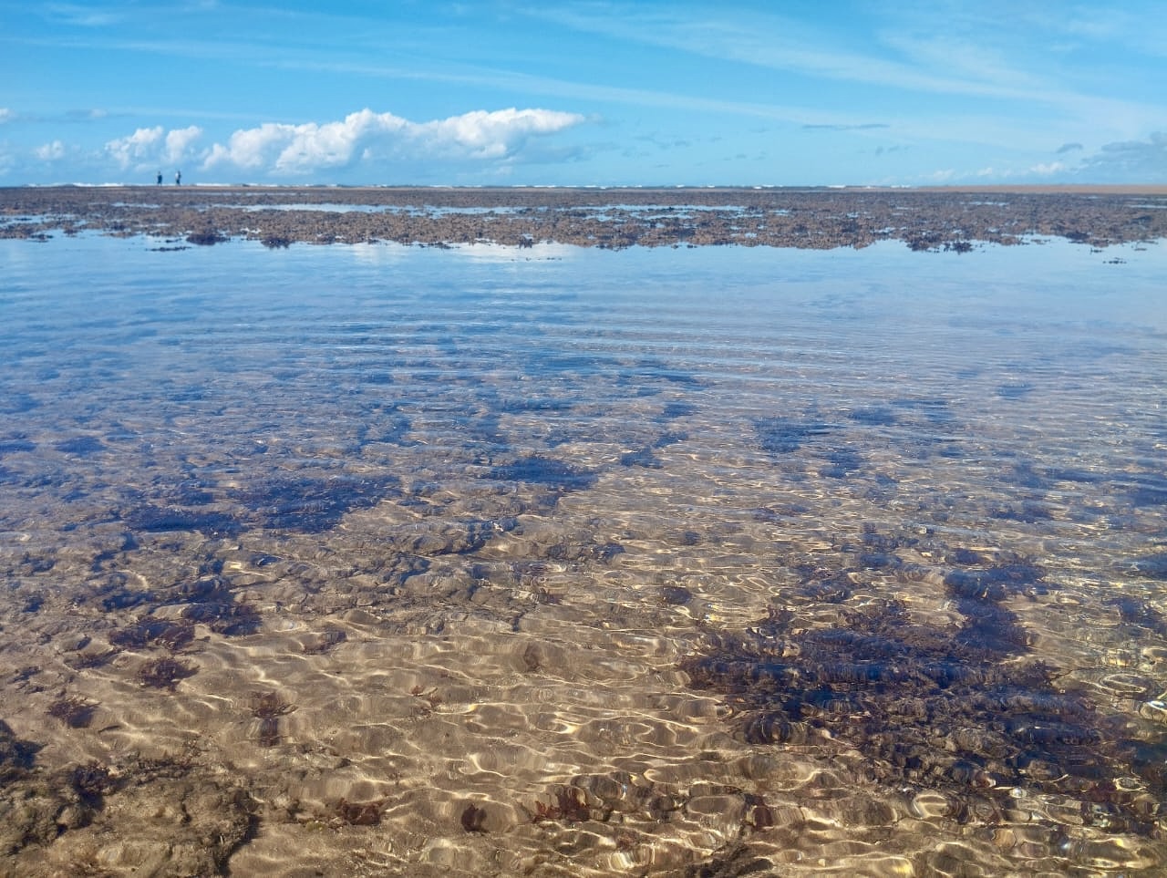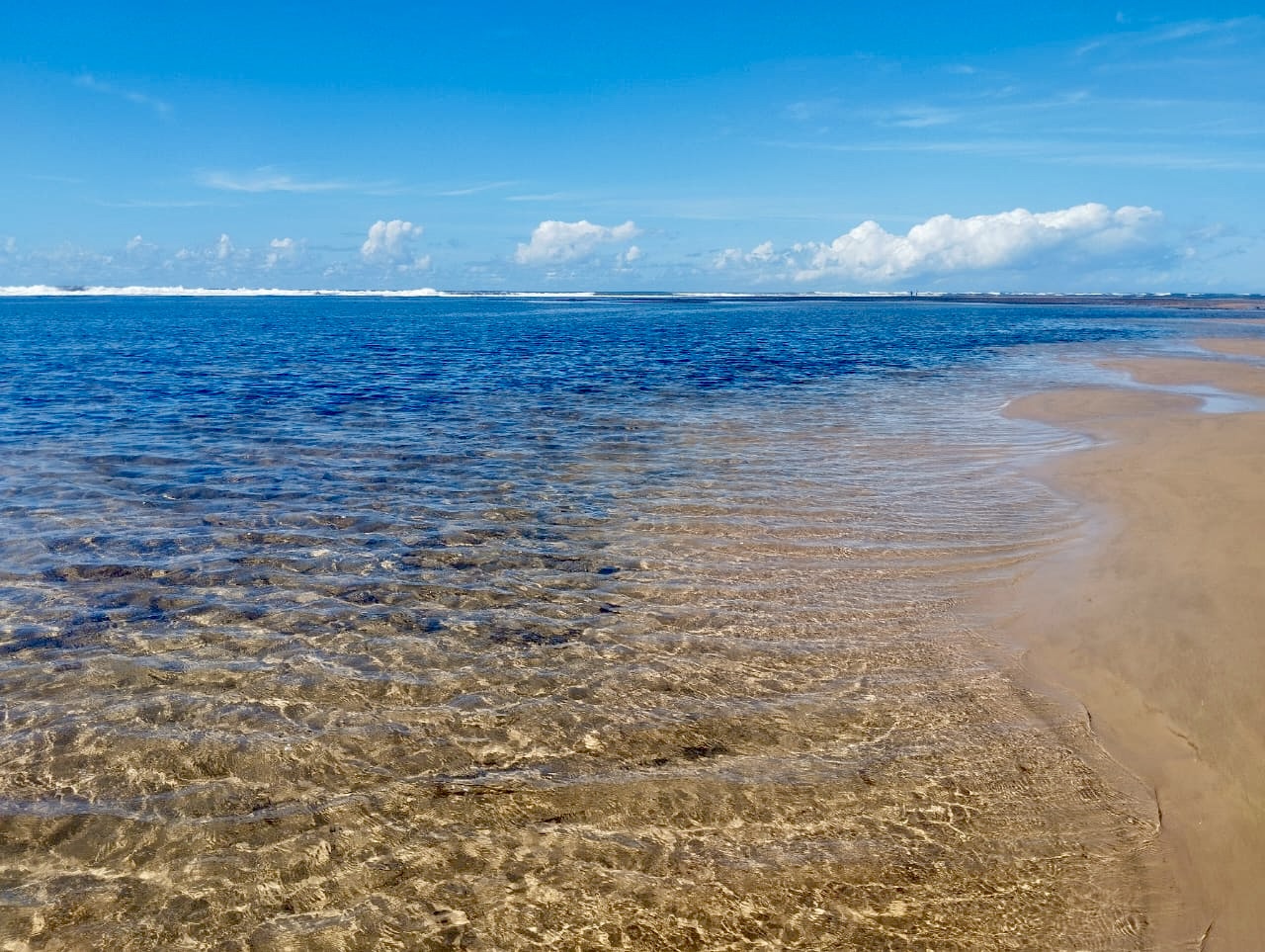 Durante a maré baixa, o mar ganha tons azul-turquesa e forma pequenas faixas de areia perfeitas para caminhar. O cenário é tranquilo e acolhedor, ideal para quem busca paz, natureza e um banho de mar relaxante.