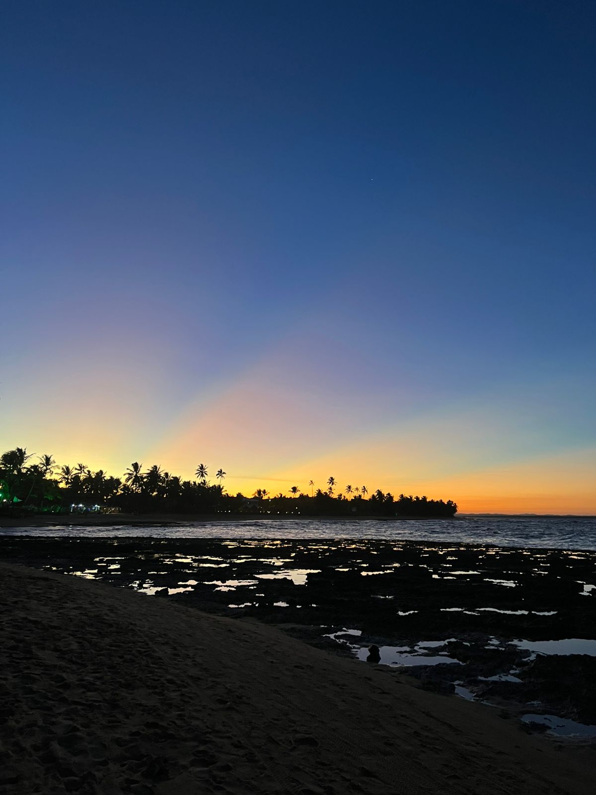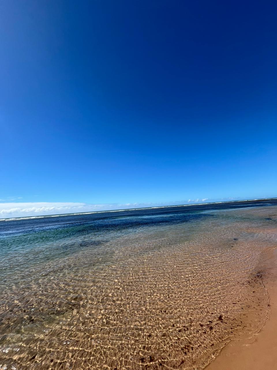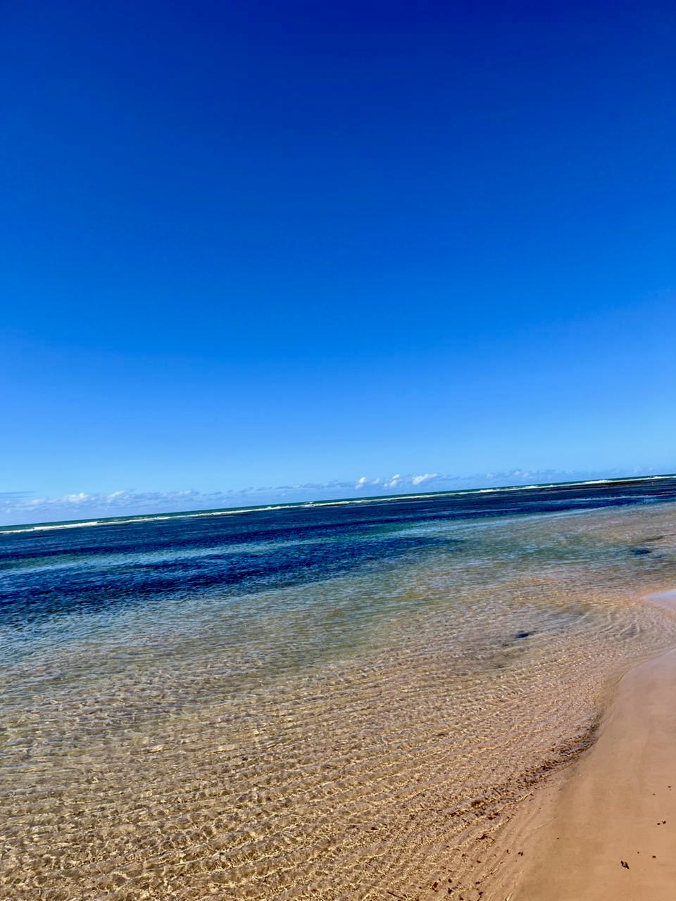Durante a maré baixa, o mar ganha tons azul-turquesa e forma pequenas faixas de areia perfeitas para caminhar. O cenário é tranquilo e acolhedor, ideal para quem busca paz, natureza e um banho de mar relaxante.
