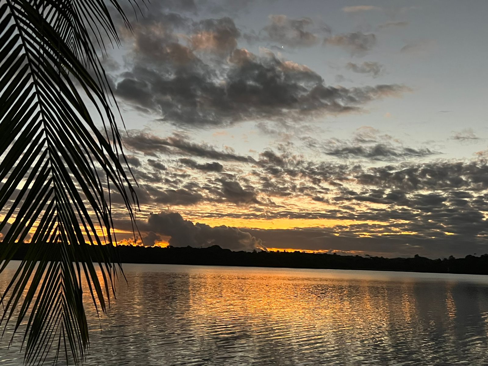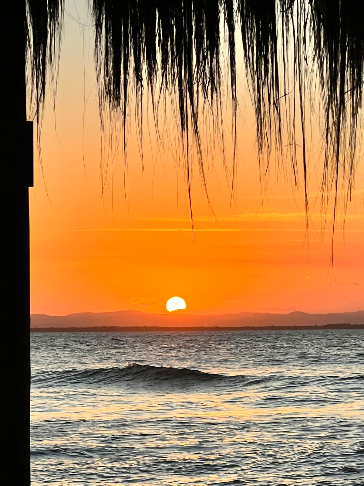 Embora o pôr do sol não seja visto diretamente dali, basta uma curta caminhada até a Ponta do Mutá, onde o espetáculo do entardecer é um dos mais famosos da Península.